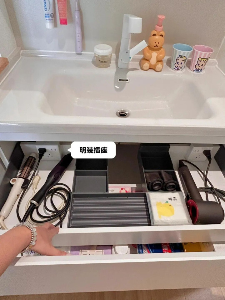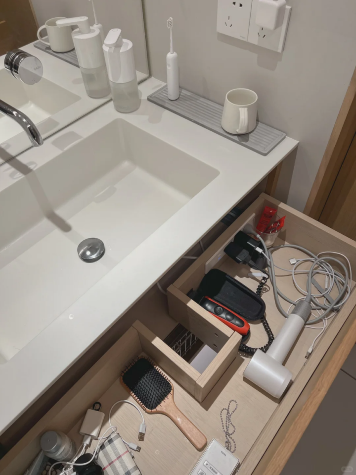 浴室柜抽屉里留几个插座,吹风机、电动牙刷等充电就不需要扯线,告别反复拔插头,这小细节也太贴心了!