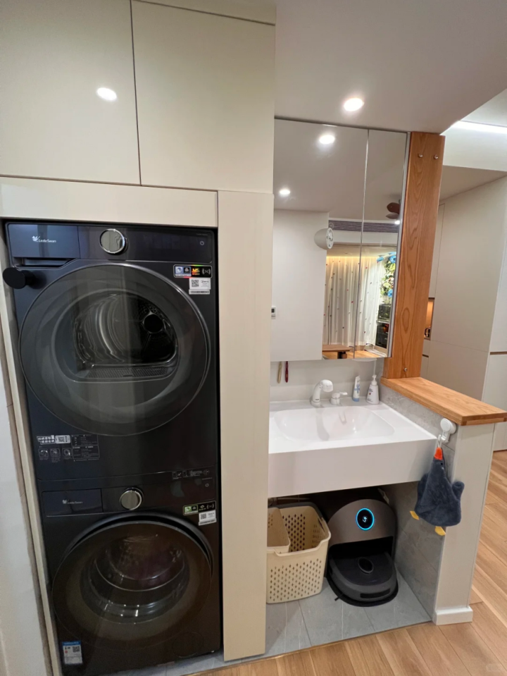我家把冰箱嵌在橱柜里,洗衣机嵌进阳台柜,不占额外空间,家里看着通透,没有乱七八糟的家电堆着,显大又显高级!