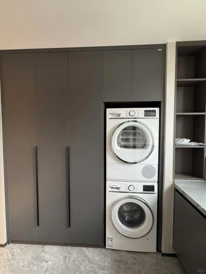 把家电嵌进定制柜里,冰箱、洗衣机、烤箱都做嵌入式设计,家里立马变整洁,视觉上也清爽,还能提升空间利用率。