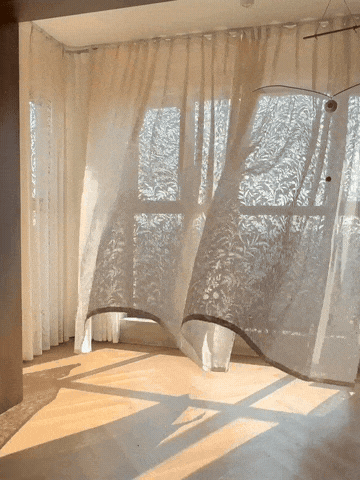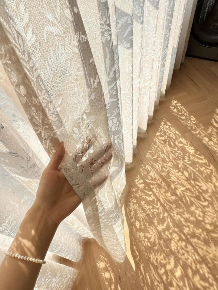 客厅装了月枝影窗纱之后,阳光透进来柔柔的,一点不刺眼,立体花纹自带模糊滤镜,外面看进来像打码,里面看出去却通透柔和,氛围感直接拿捏。