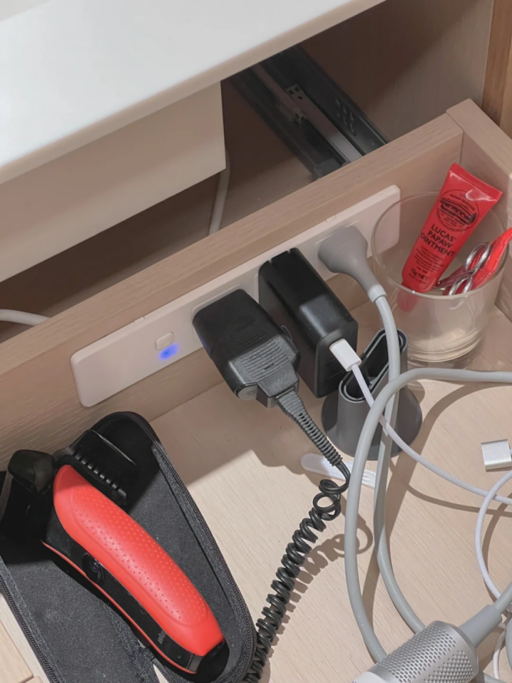 我真是大聪明,为了让台面干净极简,就想到把插座装抽屉里,吹风机什么的都可以藏进抽屉,安装好效果很好,完全内嵌了,很完美。