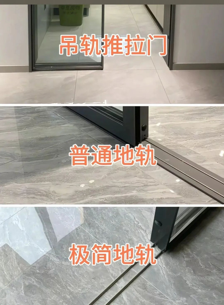 厨房推拉门,传统常规地轨,款式经典,稳固耐用,但轨道显眼,会影响整体美观,而且地轨容易积灰,难清洁。