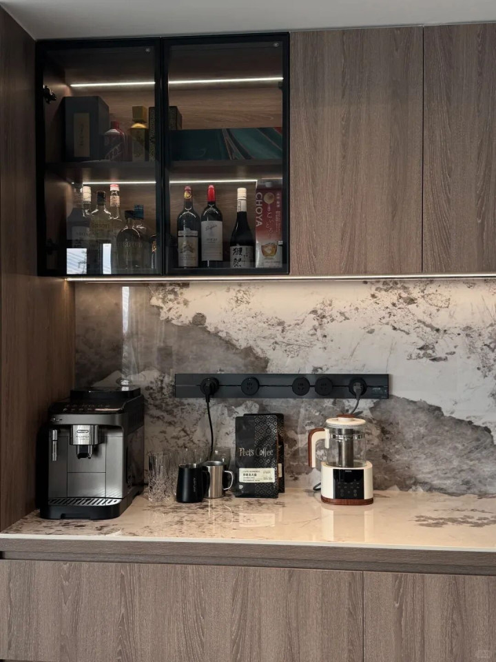 餐边柜装个轨道插座,这位置电器用的多,使用频率高,如果是普通插座的话,总不够用,所以,用轨道插座就方便多了。