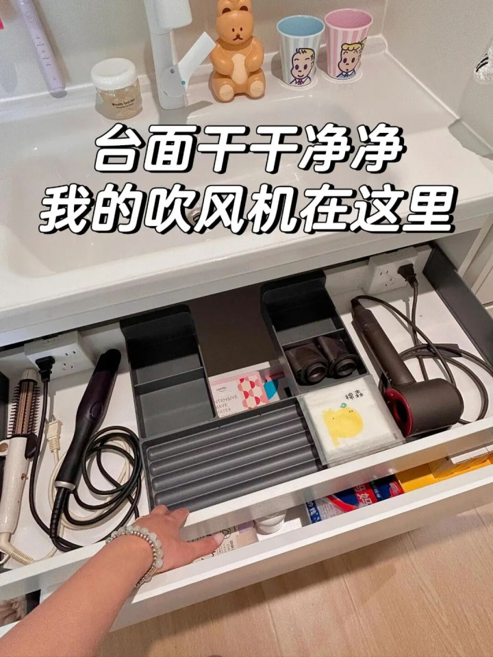 真的很懒,不想每次都插拔插头,也不想台面上装太多置物架还积灰,所以,装修时特地在浴室柜后面留了电位,每次打开抽屉举起吹风机就行,一顿操作如此丝滑,卷发棒也是如此。