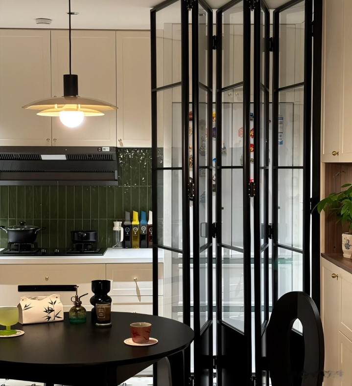 折叠门有多层联动,根据你的预算和厨房门大小决定,超窄的边框搭配着钢化玻璃,颜值很在线,不会给人压抑的感觉。
