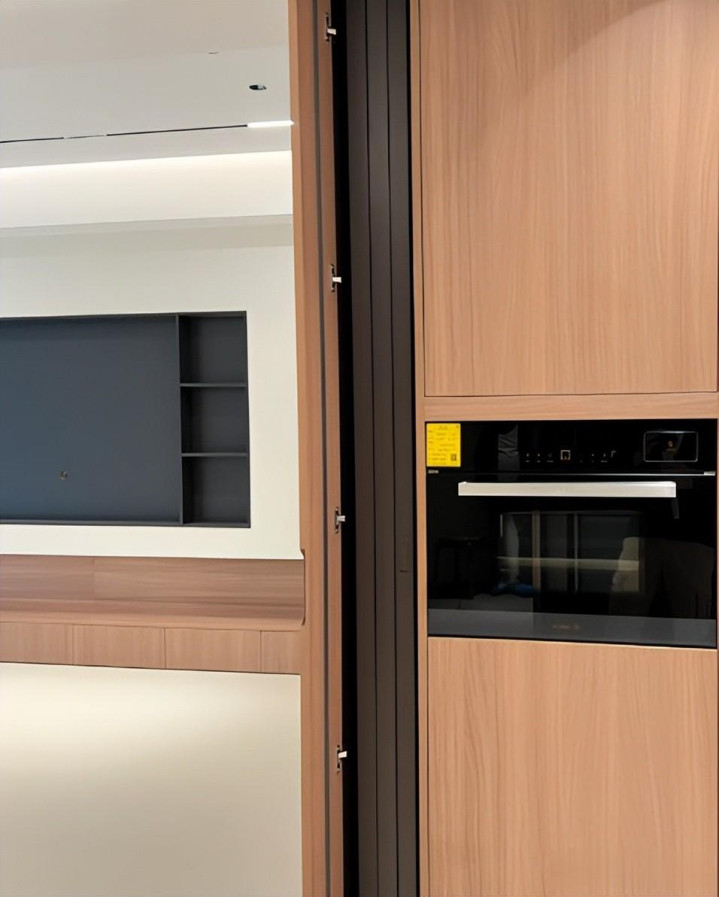 隐形门的密封性也很好,做饭时把门全部都拉上,厨房油烟不会弄得到处都是,视觉很干净,从客厅来看能真正实现南北通透。