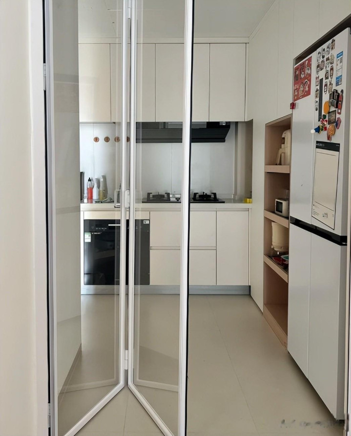 你有没有发现,本来厨房的空间就很小,门洞的空间有限,放上很大的推拉门就相当于占据了一大半的空间,门扇永远会被挡着,使用的确不方便。