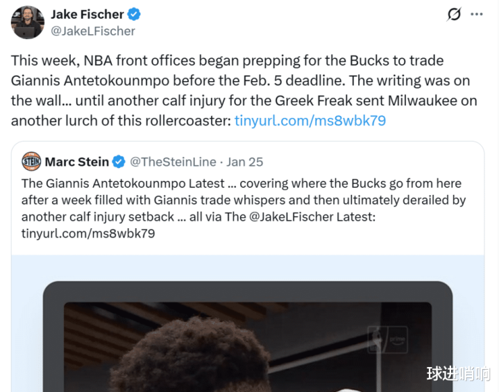 消息来自于美媒《The Stein Line》名记Jake Fischer对于字母哥潜在价值的长文分析。