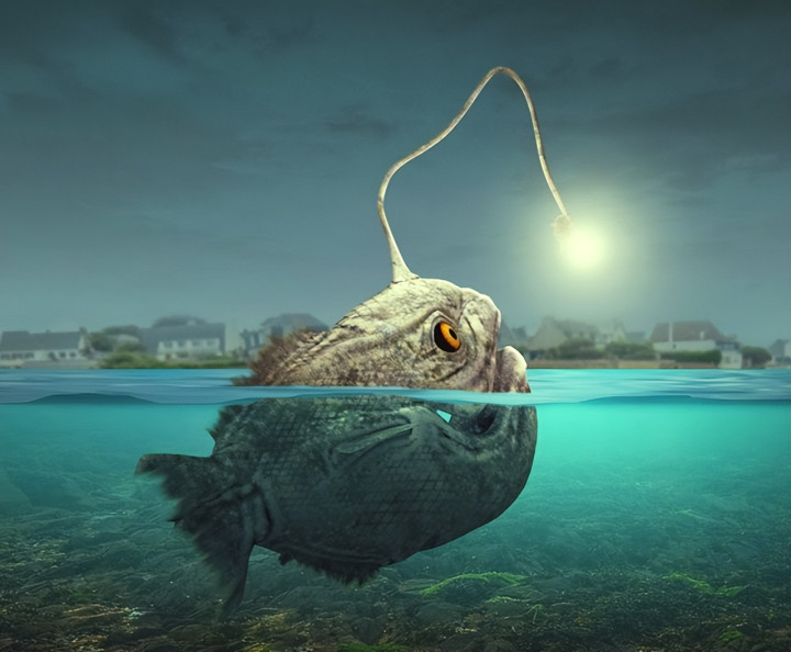 安康鱼生活在500-5000米内的深海,这种深度阳光根柢无法穿透,雌性安康鱼进化出面部具发光拟饵器官,由第一背鳍特化变成,用于诱捕趋光性猎物。