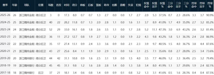 本赛季由于王奕博转投青岛队,吴前球员兼助教,余嘉豪远赴海外打球,程帅澎成为了浙江队绝对的本土核心,无奈因为伤病表现暂时没有符合预期,还需要时间才能找回应有水平。