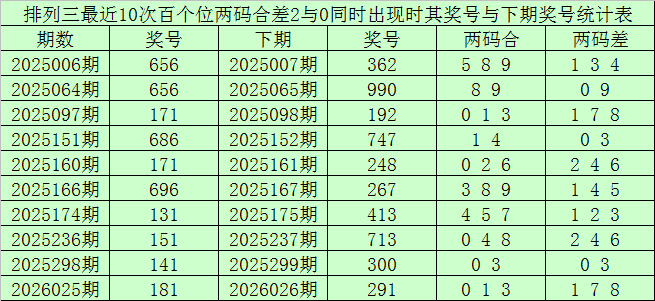 百个位合差分析:上期奖号百个位开出11组合,两码合为2,两码差为0,米兰app官网版最近10次百个位两码合2与两码差0同时出现时,其奖号和下期奖号分别为: