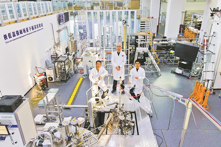 1月26日,实验站负责人、副研究员李岗,中国科学院电工研究所研究员刘建华、中国科学院电工研究所博士后周本哲(从左至右)在位于北京怀柔的中国科学院物理研究所综合极端条件实验装置极低温强磁场量子振荡实验站合影。