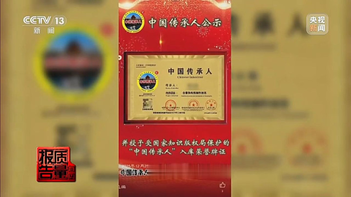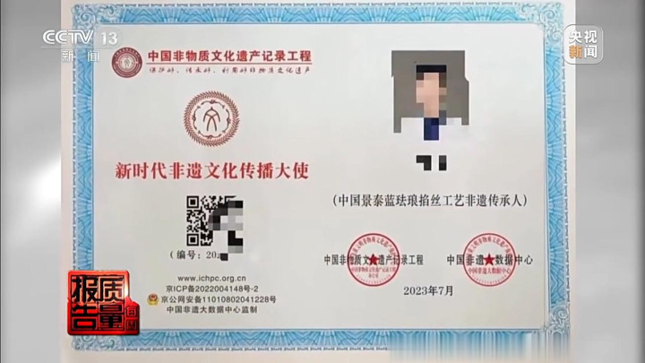 云南大学民族学与社会学院副教授苏俊杰:因为根据《中华人民共和国非物质文化遗产法》,是各级政府的文化主管部门来进行非遗项目和非遗传承人的认定,所以基本上来说,只有政府的文化主管部门才是唯一的认定的主体。那么,现在市场上有很多的一些民间机构,包括一些个人,他们发放的这些证书,实际上是不具有法律效力的。现在市场上出现的一些各种名头或者证书,实际上很多都是一些没有资质的组织,尤其是没有经过民政部门认证的这些组织颁发的,那么实际上我觉得是一个虚假的证书或者虚假的名头。