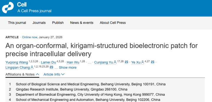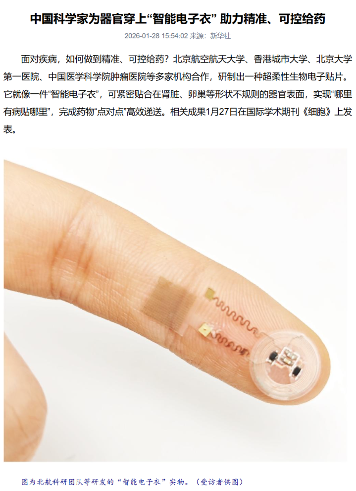 它就像一件“智能电子衣”,可紧密贴合在肾脏、卵巢等形状不规则的器官表面,实现“哪里有病贴哪里”,完成药物“点对点”高效递送。相关成果1月27日在国际学术期刊《细胞》上发表。