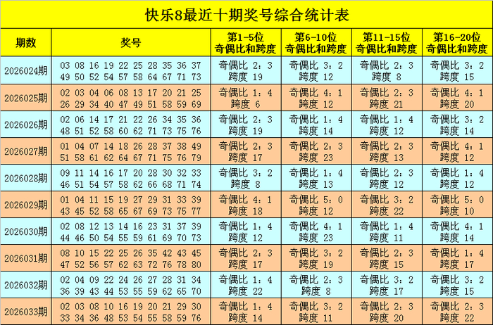 福彩快乐8第2026033期开奖回顾奖号:02 03 08 10 16 19 20 21 29 30 33 34 36 48 53 54 55 58 59 76,其中奖号奇偶比为8:12,大小比为8:12,跨度为74。
