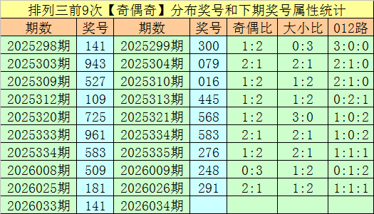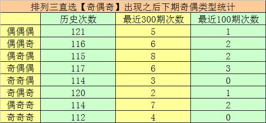 排列三第2026033期奖号为141,直选奇偶分布为:奇偶奇,该奇偶分布历史上共出现了930次,前100期出现12次。