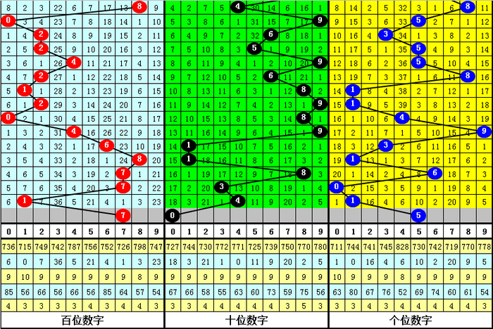 在最近9期开出奇偶分布:奇偶奇的奖号为:141-943-527-109-725-961-583-509-181,在下期出现号码分别为:300-079-016-445-568-583-276-248-291。其中百十个位号码分布情况如下: